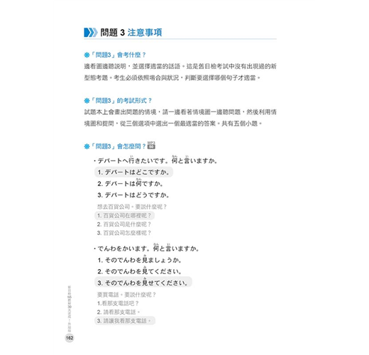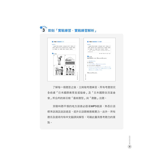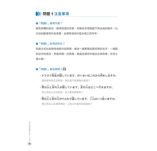 鎖定必考「課題理解」、「重點理解」、「說話表現」、「即時應答」四大題型,透過「注意事項」、「實戰練習」和「實戰練習解析」讓您完全掌握!