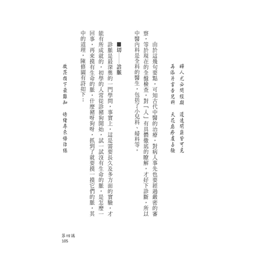 在一共十四講的內容中,南師除了學理探討分析外,對於中醫藥的實際應用,以及養生修養方面,亦多有發揮和實例解說,內容極為豐富。