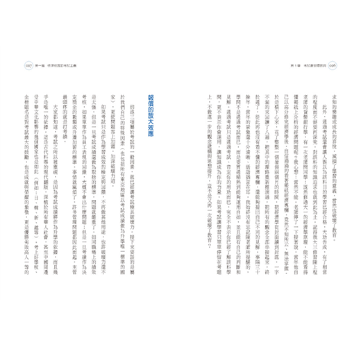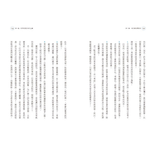 先從人類最重要的功能「思維」開始。一切的行動、判斷都是來自於思維,思維是源頭,所以思維的好不好、會不會做嚴謹的思維是關鍵。許多國家,特別是歐美地區都將嚴謹的思維,也就是「思辨能力」列為主要教育目標之一,就是著眼於擁有一個清楚的腦袋,能夠進行思辨的國民,是國力的根本。思維來自於大腦,近幾年,研究這顆宇宙中最複雜的物件有很大的突破,主要來自於認知科學的貢獻,第五章將運用這些新知來看考試教育對思維的影響。考試教育使思維侷限在簡單思考,無法發展出思辨能力,使我們判斷力薄弱,也連帶影響創新的發揮,使我們在各方面都遇到瓶頸。人的思維不僅僅在於智力反應,更重要的是能夠突破本能的直覺快思,運用深思熟慮的思辨慢想進行決斷,使事情周延合理,這是重中之重、關鍵中的關鍵,是教育的第一目標。相反的,如果教育無法培養出國民的思辨能力,會對國力產生最致命的影響。