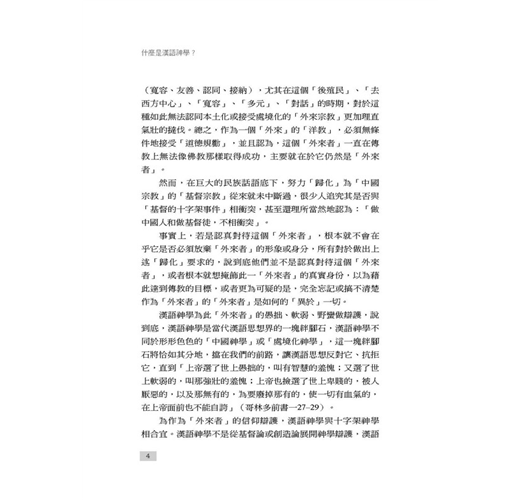 在中國近代的思想上,作為中國的「外來者」的基督教,被理解為應該成為中國「土生土長」的東西。作者認為,在一些據稱是「神學家」的漢語人那裡,他們竟想修改愚拙、絆腳石、羞辱,以符合儒家成仁、道家得道、佛教圓融的期待,這不是一種自以為像上帝一般有智慧的表現嗎?