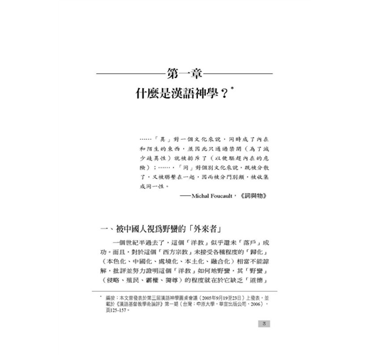 本書從社會、文化、歷史、政治、聖經的翻譯及詮釋等問題深入探討基督教在漢語社會中的處境、漢語神學的發展以及所面臨的挑戰。