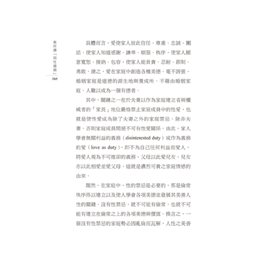 顯然,在家庭中,性的禁忌是必要的,那是倫常秩序得以建立以及使人學會各項美德並發展其美善人性的關鍵。沒有性禁忌,就不可能有倫常,也就不可能有建立在倫常之上的各項美德與價值。換言之,一個沒有性禁忌的家庭勢必因亂倫而瓦解,人性之美善將無法實現,因為無禁忌地追求性歡樂將使人成了極端排他的自我中心者,自私、暴力、仇恨、詭詐、謊言、不忠誠、不負責等等惡德皆由此而生。