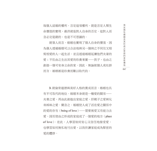 3.就倫常道德與美好人格的養成而言,婚姻也具有不可取代的地位。婚姻本身就是一種愛的關係──夫妻之愛,再由此創造出家庭之愛,即親子之愛與兄弟姊妹之愛。簡言之,婚姻使人成了活在愛之關係中的愛的存有(being of love)──需要被愛又有能力去愛,因而使由之形成的家庭成了一個愛的地方(place of love)。在此,人學習如何安心又信任地接受愛,也學習如何無私地付出愛,以致於讓家庭成為緊密的愛的體群。
