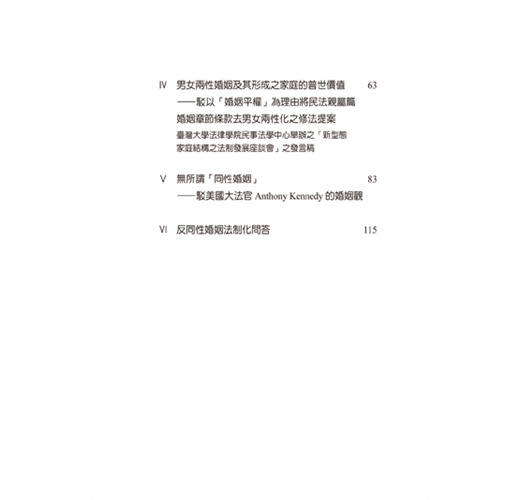 臺灣法界當然也受此風潮影響,逐漸屈服。新世代法律人尤其如此,視法制化同性婚姻乃理所當然的司法革新進步,視重新定義婚姻、家庭與基本倫常關係為尊重基本人權之必然要求。但細察此等法律人所謂「婚姻平權」或「多元成家」言論,其立論甚為淺薄,毫無深刻、嚴謹之法理可言,反倒充滿特定意識形態與媚俗的煽情修辭。