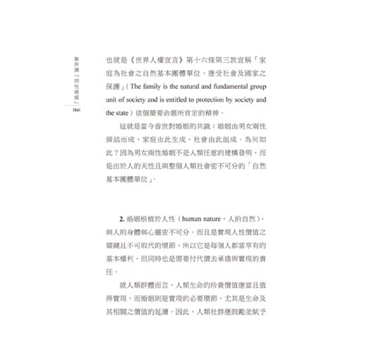 2.婚姻根植於人性(human nature,人的自然),與人的身體與心靈密不可分,而且是實現人性價值之關鍵且不可取代的環節,所以它是每個人都當享有的基本權利,但同時也是需要付代價去承擔與實現的責任。