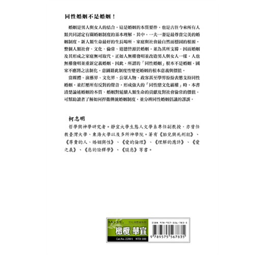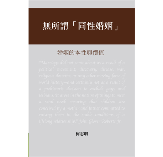當媒體、演藝界、文化界、公眾人物、政客甚至學界紛紛表態支持同性婚姻,並打壓所有反對的聲音,形成強大的「同性戀文化霸權」時,本書清楚論述婚姻的本質、婚姻對延續人類生命的貢獻及對社會倫常的價值,可幫助讀者了解如何捍衛傳統婚姻制度,並分辨同性婚姻倡議的謬誤。
