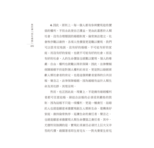 4.因此,原則上,每一個人都有參與實現這些價值的權利,不但由此使自己獲益,更由此嘉惠於人類社會。沒有合理穩固的婚姻制度,倫常無法建立,社會秩序難以維持,各項人性價值更是難以實現。我們可以很肯定地說,沒有好的婚姻,不可能有好的家庭;而沒有好的家庭,也就不可能有好的社會;而沒有好的社會,人的生命價值也就難以實現,個人的尊嚴、自由、權利也就難以得到保障。因此,法律積極保障婚姻不但是對個人權利的肯定,更是對以婚姻貢獻人類社會者的肯定,也是這個貢獻者當得的公共回報。簡言之,法律保障婚姻,因為婚姻有益於人類生命及其社群。其理至明。
