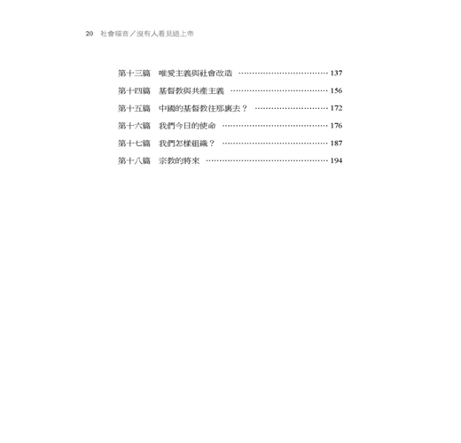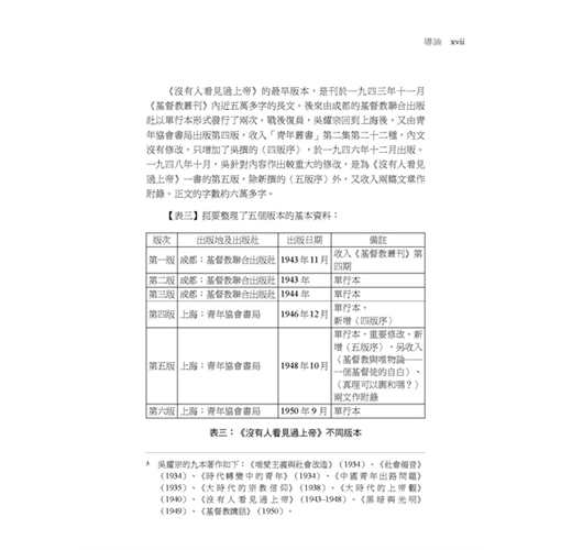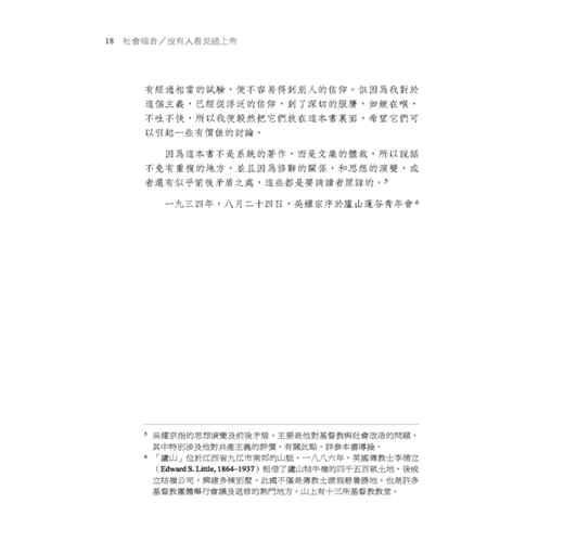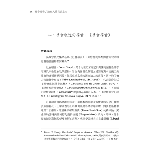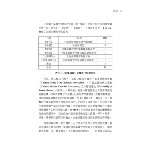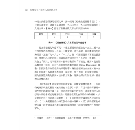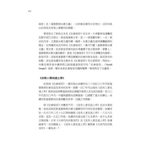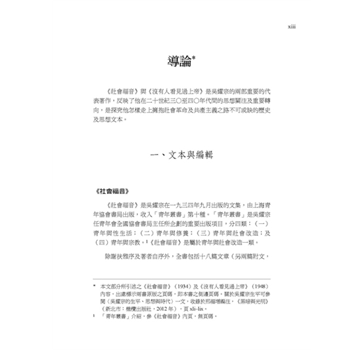 本冊收錄《社會福音》與《沒有人看見過上帝》是吳耀宗的兩部代表作,反映了他在二十世紀30至40年代間的思想關注及重要轉向,是探究他怎樣走上擁抱社會革命及共產主義之路不可或缺的歷史及思想文本。