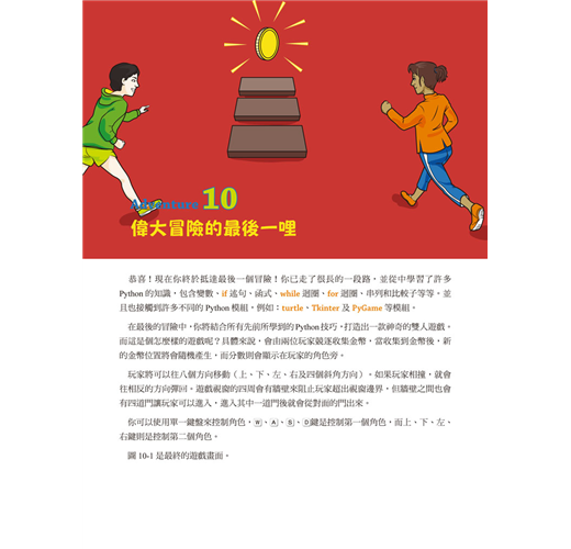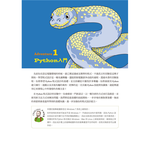 在你體驗Python冒險的同時,也將學習到寶貴的程式設計技能!Python是當今最熱門的程式語言之一,它不僅已被Google、YouTube、BBC及Spotify等公司所採用,並且也是Raspberry Pi單板電腦所支援的主要語言。學習Python是步入程式設計領域的絕佳途徑,而透過本書更能夠確保學習過程是簡單且富含樂趣的。