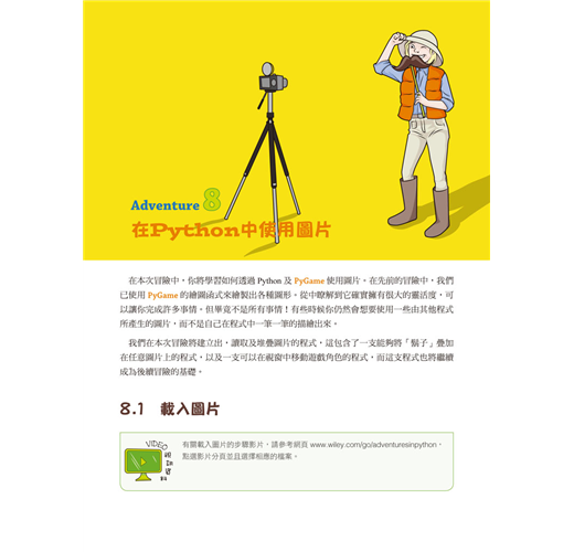 本書的資源網站:www.wiley.com/go/adventuresinpython,提供了線上影片教學,及其他有用的資訊,幫助你在Python之路上走得更加輕鬆。學會Python語言後,你便擁有紮實的基礎,可以進一步學習其他的程式語言,例如:C++、Objective-C及Java等。事不宜遲,開始學習你的第一門程式語言吧!