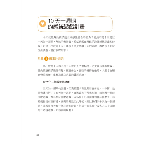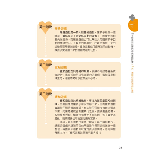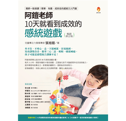 阿鎧老師精心設計的10天感統遊戲計畫,每天1小時,搭配有趣的3階段遊戲,正面強化孩子大腦處理外在訊息的能力,提升學習時的專注力、對環境的觀察力、面對挫折的容忍力,使情緒穩定,有耐心解決生活及課業問題,獲得人緣與自信。