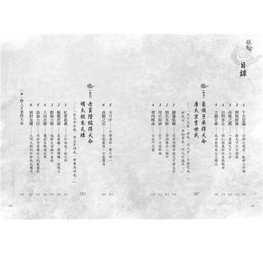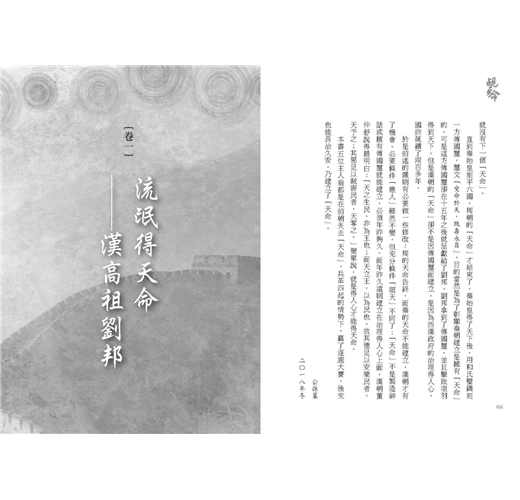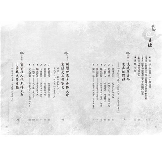 而是不要只看歷史的表面,嘗試深入探索「天命」源何而來。本書選擇了五位開國君主,都是因為前朝天命終結而興起,其中只有曹操未能建立「天命」,另外四位:劉邦、劉秀、李世民、朱元璋則各自建立了一個長久的王朝,並也因此而贏得了撰史權,於是史書上充斥關於他們的各種神蹟,要做為其「天命」之佐證。