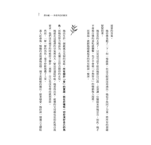「如果被看見會怎樣呢?會被嘲笑、被厭惡、被否定?還是會被拋棄、被不再需要?你只是一個人,卻得承擔那麼多的角色。當你只是一個女兒時,或許還可以追求完美,但現在你是妻子,又是母親,你要如何滿足那麼多的期待而不感到疲倦?那些挫折,怎能不讓你感到無助而哀傷?