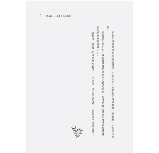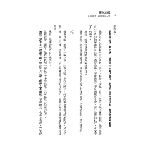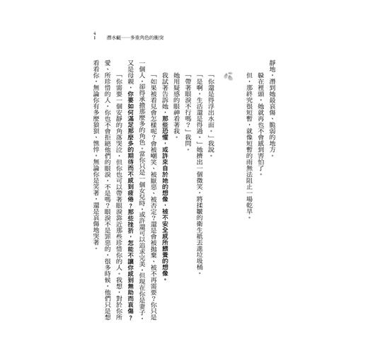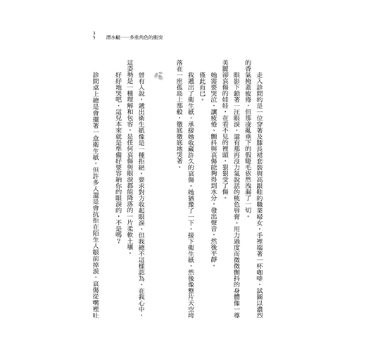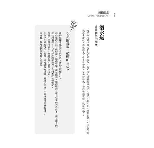 而受傷的自己只能躲藏:藏起疲倦,藏起脆弱,藏起眼淚,藏在完美的角色底下,藏在偉大的母性烈焰裡──只在靜靜的深海裡,我們才敢放聲哭泣。