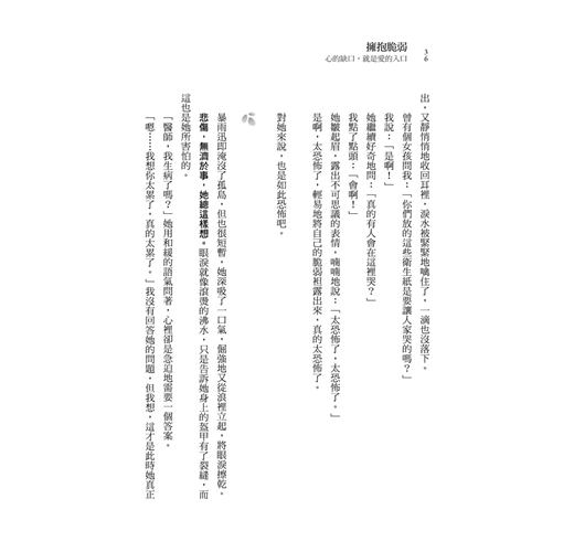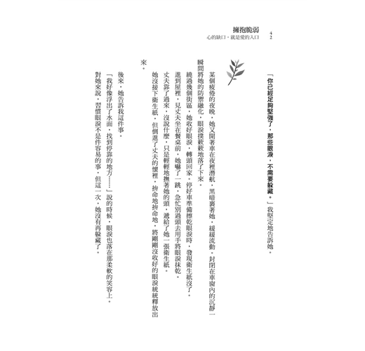 「你需要一個安靜的角落哭泣,但你也可以帶著眼淚靠近那些珍惜你的人。我想,對於你所愛、所珍惜的人,你也不會拒絕他們的眼淚,不是嗎?眼淚不是罪惡的,很多時候,他們只是想看看你,無論你有多麼狼狽、憔悴,無論你是笑著,還是哀傷地哭著。