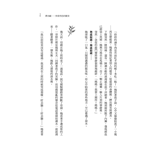 她要求自己扮演好所有的角色:妻子、媳婦、女兒、員工,還有不眠不休的母親。她不允許自己有片刻缺席或絲毫怠慢。盛裝登場,華麗演出,不是想贏得掌聲,而只是害怕批評,承受不了任何虧欠。