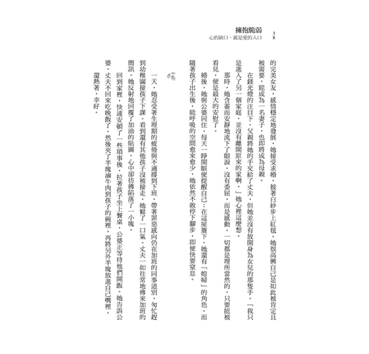 我們所能做的,是提醒自己,在成為父母親之前,我們是獨立而完整的人,成為父母親之後,我們依然是,沒有人會突然變成聖人。承認吧!養兒育女帶來的不只有喜樂感動,還有焦躁、悲傷、氣憤、嫉妒、憎惡等真實情緒。唯有正視自己不堪與脆弱的模樣,才能做到堅強,為自己做出選擇,跳出「不夠好的父母」框架,選擇成為「成長中的父母」,當「學習愛自己的父母」。