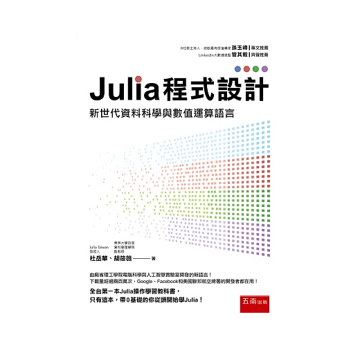 在這樣龐大的熱情以及專業下所誕生的這本教材,相信能成為由淺入深地學習 Julia 這個新興語言的最佳利器:不管是基礎的資料結構、運算,到使用各式各樣的套件完成工作,或是利用漸漸成為程式開發主流的函數式程式設計(Functional Programming)以及Metaprogramming來撰寫高效能的 Julia 程式,本書可說是無所不包。一起來體驗「Python 般的程式撰寫,如 C 般的運算效能」的Julia吧!