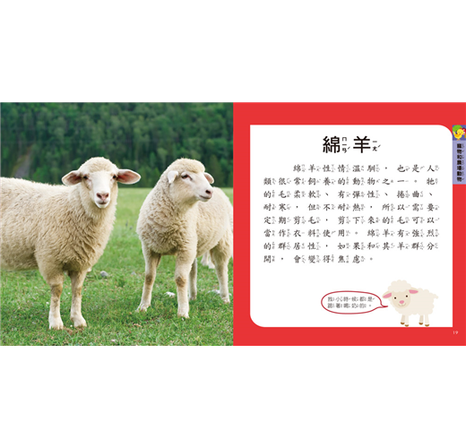可愛插圖配上有趣、知識性的介紹,以第一人稱介紹動物的小知識可引起孩子興趣。