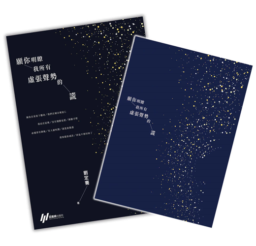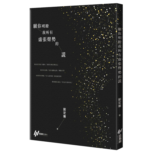 劉定騫第二本詩集《願你明瞭我所有虛張聲勢的謊》,共分為五輯:失物招領、無人之境、逢魔之時、夜晚都知道、歲月的歌。