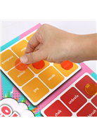 3.學生每人輪流抽一張牌並唸出單字,若抽中的牌剛好是自己格子中的單字,則可以放上自己的小圓片