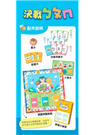 ‧注音符號卡59張、命運卡13張、人物卡1張、遊戲底板6張、骰子1個、遊戲說明書1張、拼音小祕笈1本