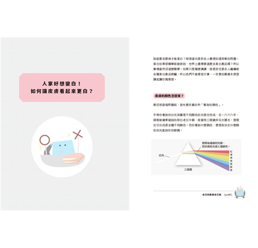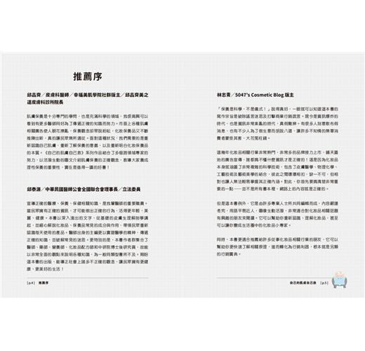 但是這本書例外,它是由許多專業人士所共同編輯而成,內容嚴謹考究,用語平易近人,圖像生動活潑,非常適合對化妝品相關話題有興趣的朋友來閱讀。它可以幫助你重新認識、理解化妝品,甚至可以讓你變成生活圈中的化妝品小專家。