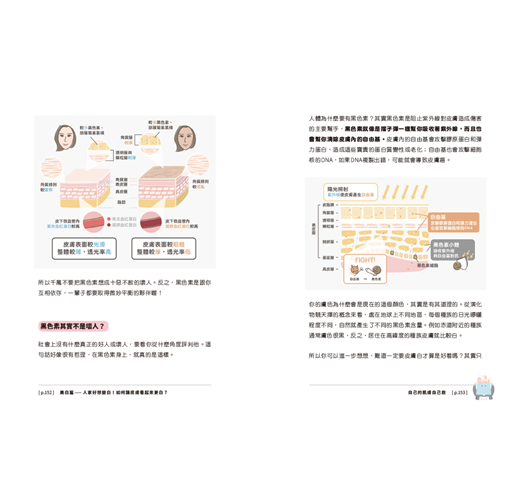 人為什麼要有黑色素?其實黑色素是人類阻止紫外線對皮膚造成傷害的主要幫手,黑色素就像是擋子彈一樣幫你吸收著紫外線,而且也會幫你清除皮膚內的自由基。皮膚內的自由基會攻擊膠原蛋白和彈力蛋白,造成這些寶貴的蛋白質變性或老化;自由基也會攻擊細胞核的DNA,如果DNA複製出錯,可能就會導致皮膚癌。(書中另有附圖說明)