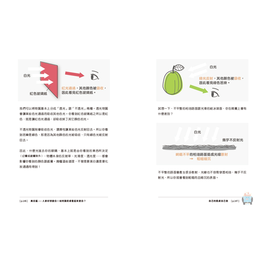 不透光物質則會吸收色光,選擇性讓某些色光反射回去。所以你看到芭樂是綠色,那是因為其他顏色的光被吸收,只有綠色光被反射了。(書中另有附圖說明)