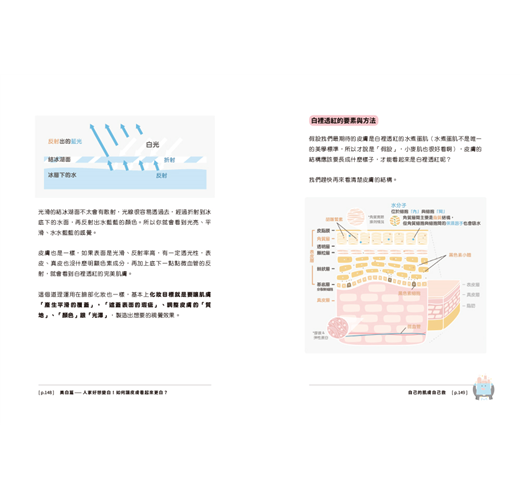 光滑的結冰湖面不太會有散射,光線很容易透過去,經過折射到冰底下的水面,再反射出水藍藍的顏色。所以你就會看到光亮、平滑、水水藍藍的感覺。(書中另有附圖說明)