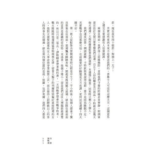 我繼續說:「法蘭茲,沒有兩條腿都截肢算是萬幸了。維格勒更慘,他失去了右手臂。更何況你可以回家了。」