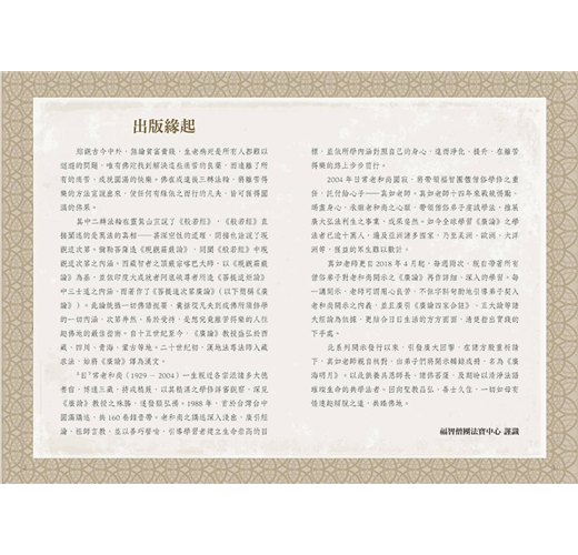 【內容特色】1、一季出版一冊,全套達160冊,為具規模的佛法開示全集。