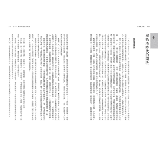 除了詳盡介紹梅校長主持校務的一步一腳印,《大學與大師》同時更以宏觀的視野,書寫清華從成立學堂,以迄梅校長主持校務期間的曲折成長蛻變過程。特別是在民國初年北洋軍閥割據直到抗戰軍興期間,反覆多變的政局,引發一波又一波的學潮,幾位派任的校長猶如走馬燈,直至梅校長主持校務後才告穩定下來。這一段清華校史,經由岳南先生的詳盡敘述,益發凸顯梅校長主政後,學校得以在安定中逐漸茁壯成長的難能可貴。