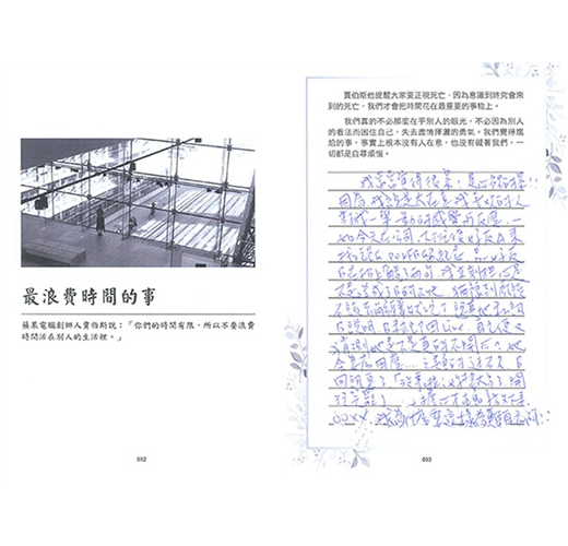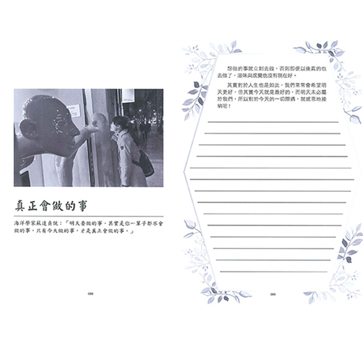 座右銘是「一生玩不夠」,生命中最期盼獲得的禮物是「慈悲」與「智慧」,智慧的追求透過閱讀,慈悲則靠號召朋友從事公益服務人群來實踐,因此生活的重心是「閱讀、朋友、大自然」。