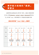 語源學習法是將組成英文單字的「零件(語源)」拆開來學習的方法。例如attraction、contract、extract、distraction都有表示「拉」的字根「-tract」,再與各種字首、字尾組成有意義的字彙。