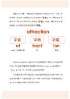以attraction來說,at是表示方向或對象的「朝向」字首ad的變化型(字首ad會根據後面所接續的音而有ac、at、al、ar、ap等變化)。「tract」是代表「拉」的字根,ion是名詞字尾。