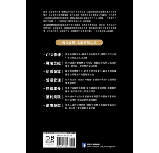 持續成長|要不斷往上成長發展,需要天時、地利與人和的好條件。學會評估風險與商機,整合資源與策略結盟,能激勵對的團隊。經營者需要智慧清明,不被經營盲點所困惑,讓企業得以順利站上成長市場的風口。