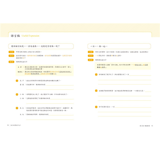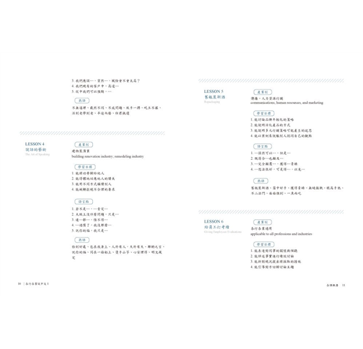在語言點的挑選上,不同於傳統語法點的做法,呈現較長的句式,並具體說明與練習這種語言表達方式可以用在什麼商業情況下。