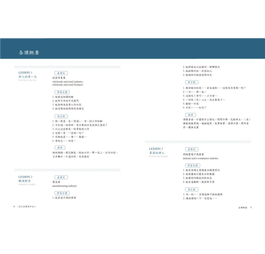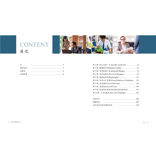 這個教材分為上下兩冊,每冊10課,第1冊的主題著重在公司內部的交流或同事、朋友間談論工作的情境。第2冊則著重在公司與外部的交流實況。因此課文的主題情境小自描述新人的第一天、員工旅遊、產品的行銷、客訴的處理,大至裁員、公司併購等議題都囊括在內。每冊課文以1-2個對話為主。每段對話後有生詞和語言點(useful expression),以加強學習者對詞語、句式的運用。另有回答問題、個案分析(case study)、課室活動以及文化點。書末則附上詞語索引和簡體課文。