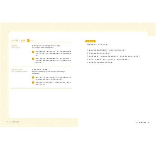 Each volume includes a textbook, a workbook and a teacher’s manual. Each chapter contains dialogue-based question, case study, culture appreciation unit and comprehensive exercise.