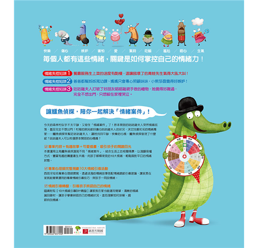 書中運用主角鱷魚偵探遇見的情緒案件,結合孩子生活上的相關情景,以淺顯易懂方式、豐富有趣的圖畫讓孩子產生共鳴,同時具有專業的情緒引導,向孩子解釋常見的10大情緒狀況,輕鬆理解生活中常有的情緒狀態。