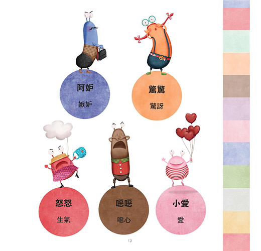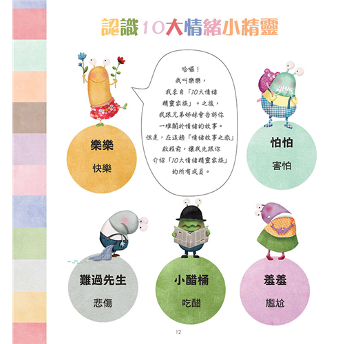 書中將常見的10大情緒化身為10個可愛情緒小精靈,每一個情緒小精靈都會提供各式各樣的方法,跟孩子一同面對不同的情緒、理解情緒的成因、學會辨別不同的情緒,並且懂得如何「調節我們的情緒」。讓孩子理解「情緒波動是正常的現象」,但是,當某種情緒表現過於激烈,或是持續過久,就必須學會如何管理。