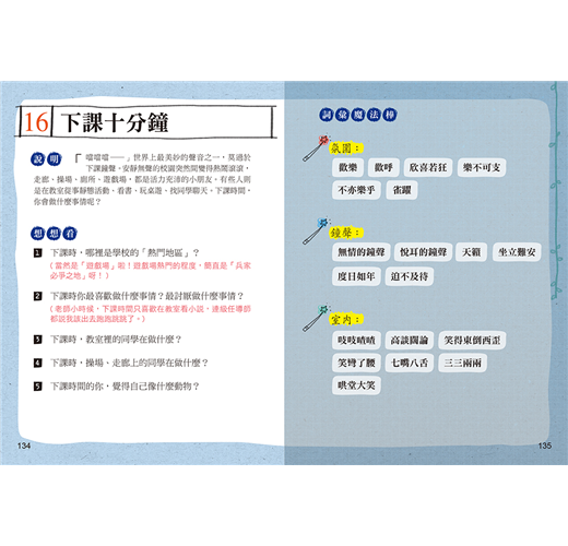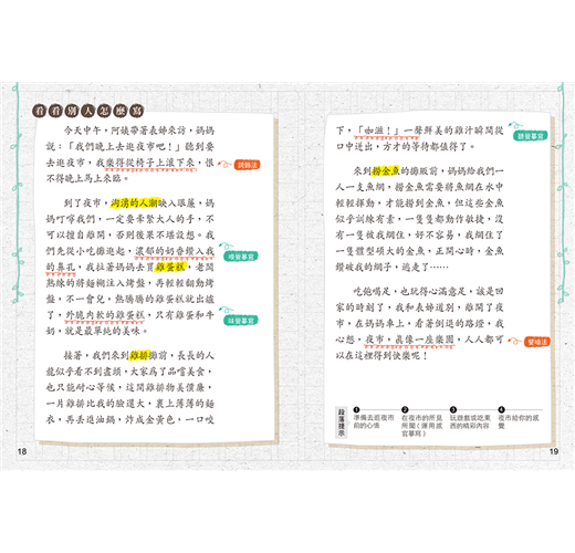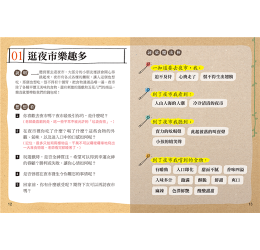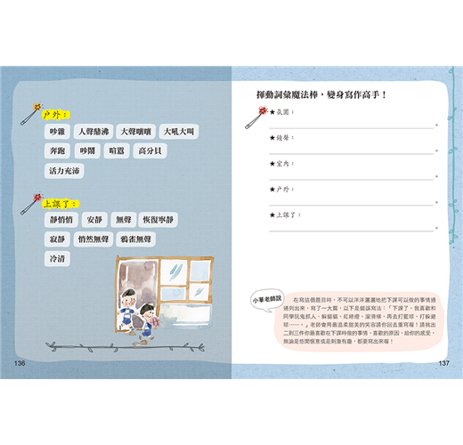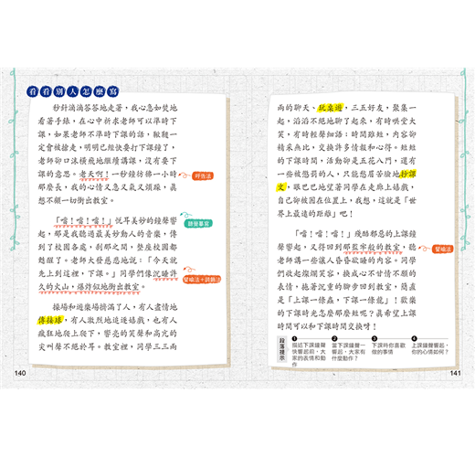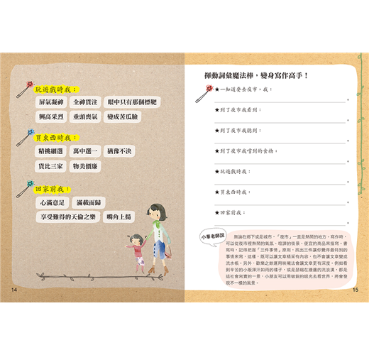 書中的「想想看」就像小華老師和學生對話般,用輕鬆的文字描述討論;而「詞彙魔法棒」則是讓孩子的文章更加豐富多元,可以彌補詞彙量不足的困擾。「小華老師說」是給孩子的寫作叮嚀,點出孩子在寫這篇文章時可能會遇到的盲點,最後「看看別人怎麼寫」,讓孩子參考一篇首尾完整的文章應該如何完成,以及瞭解語句的流暢性。