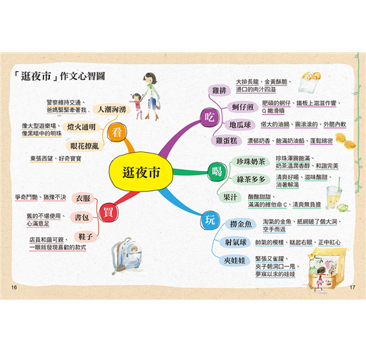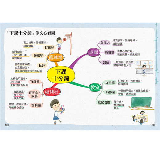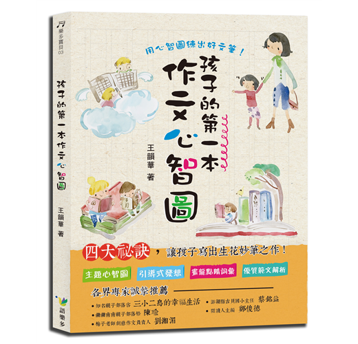 這本《孩子的第一本作文心智圖》藉由三十個貼近孩子生活的場景,讓他們產生共鳴,運用心智圖,激發孩子生活所見之素材,當身處一個場景時,可以從哪些方向觀察,讓思緒更加縝密,強化思考的深度與廣度並開啟思考的活口,突破不知從何下筆的困境。