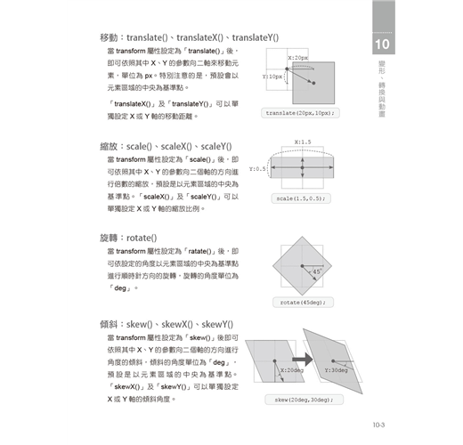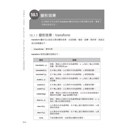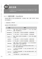 在CSS3中可以使用transform屬性來設定元素的變形效果,進行移動、縮放、旋轉、傾斜等變化。transition轉換效果是指元素由一種樣式轉換到另一種樣式的動作,可由播放時間、轉換屬性、轉換方法及延遲時間的屬性進行設定。animation動畫效果就是由播放的起點到終點設定多個關鍵影格,接著指定元素在每個關鍵影格中屬性有不同的變化所呈現的動畫。