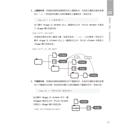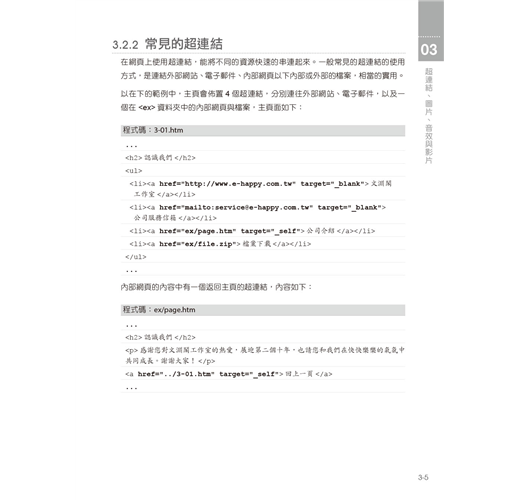 超連結是HTML 中很重要的一個元素,藉由超連結能夠將不同的網站連繫在一起,也能連結到不同的網站,甚至是不同的資源。除了文字之外,圖片、音效與影片更是HTML 中很重要的內容。本章將要說明如何在網頁中加入圖片、音效與影片,並說明HTML5 新增的元素與功能,讓多媒體的資源豐富您的網頁與內容。