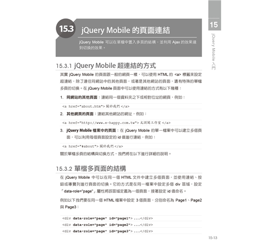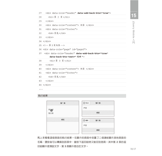 jQuery Mobile提供了許多常用元件,讓行動裝置的畫面與一般原生程式的操作更接近。其中包含了按鈕、群組按鈕、導覽列、檢視清單、版面格點、可摺疊內容區塊、可摺疊內容區塊組、對話方塊及側邊欄面板。只要能善用這些元件,即可快速製作出精美而實用的使用介面。