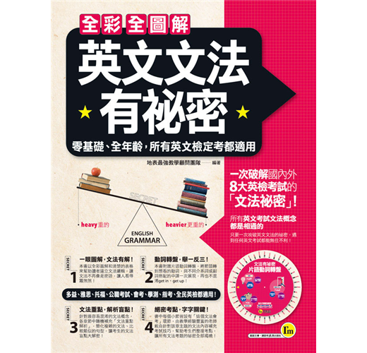 文法就是語言的規則,自然不管哪個英文考試文法概念都是相通的,那麼只要用《全彩全圖解英文文法有祕密》一次破解英文文法的祕密,遇到任何英文考試都能無往不利!不論多益、雅思、托福、公職考試、會考、學測、指考、全民英檢等國內外英檢考試都適用!