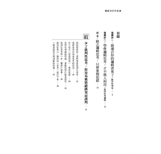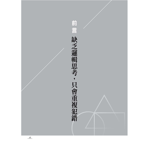無論你是什麼職業,你的專長是什麼,都不能不把「邏輯」學好;因為「邏輯」就是可以讓你突破困境、更上層樓的關鍵。並且在這個資訊量爆炸、假消息充斥的時代,惟有「邏輯」可以讓我們具有分辨真假、獨立思考的智慧。