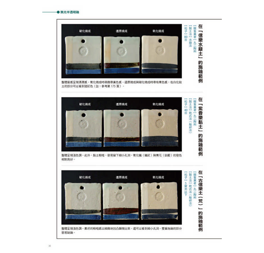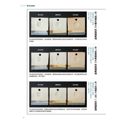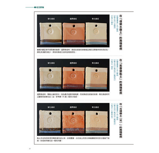 本書的燒成是以電窯進行氧化燒成、還原燒成、碳化燒成(冷卻還元)等3種不同燒成方式。每種燒成方法都是以9號測溫錐約45度熔倒(1250℃,精煉30分鐘)作為燒成條件。還原燒成的溫度設定在950~1250℃左右,還原時間約5小時。碳化燒成則是除了上述條件外,在1100~800℃冷卻時也施以還原處理。